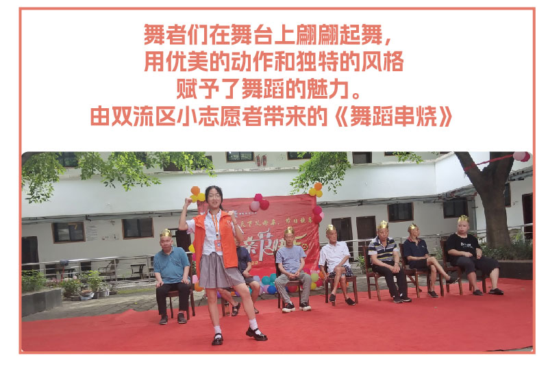 在这里,双流区小小志愿者为老人们献上了自己的才艺,祝福老人们天天开心。