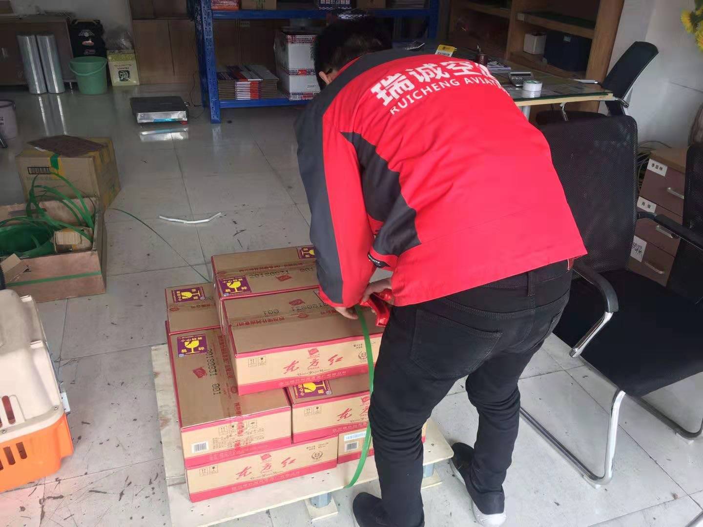 成都瑞诚航空货运有限公司,因酒水比较贵重,和发货人协商对酒水类进行打包二次外包装打包,加托板进行货物的加固。并要对货物对防水措施,用缠绕膜缠绕外包装,防止雨水打湿。并对货物贴易碎和向上等警示标识。